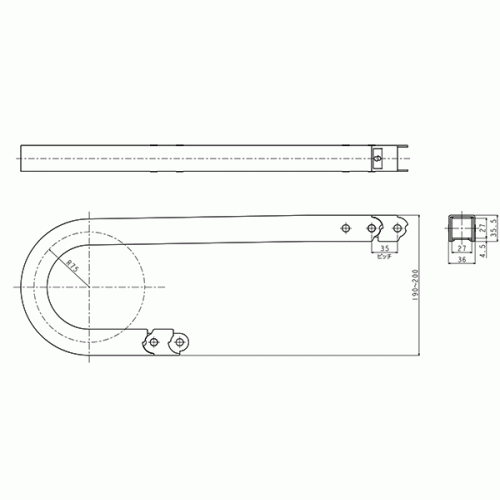 内高さ(mm):27、内幅(mm):27、屈曲半径(mm):R75、ピッチ(mm):35、カバー:ショートカバー、セパレーター取付け可能、材質:ポリプロピレン